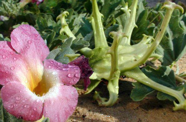 Ботаническое описание. Родина гарпагофитума — Южная и Юго-Западная Африка. Местные жители уже давно используют это растение как лекарственное. У гарпагофитума на корнях образуются крупные клубневидные утолщения. К началу сезона дождей вырастают надземные побеги, достигающие метровой длины; они простираются по земле и образуют ярко-красные цветки, которые сидят в пазухах листьев. У плодов гарпагофитума образуются одревеснелые длинные разветвленные выросты, снабженные загнутыми назад крючьями. С этим связано название «чертов коготь», которым иногда наделяют это растение.