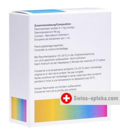 Десмопрессин не проникает через ГЭБ. Десмопрессин выводится почками, T1/2 составляет 2,8 ч.