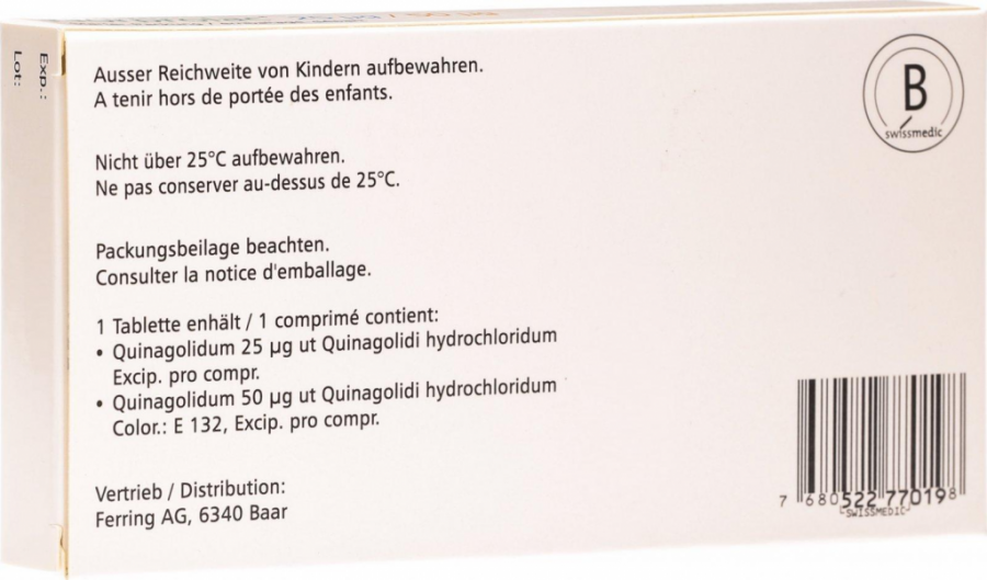 Выведение. Более 95% выводится из организма в виде метаболитов с калом и мочой примерно в равных количествах. Основными метаболитами, обнаруженными в моче, являются сульфатные и глюкуроновые конъюгаты хинаголида и его N-дезэтилированного и N, N-дидезэтилированного аналогов. В кале обнаружены неконъюгированные формы этих трех веществ.