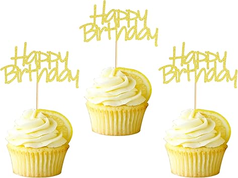 24 szt. toppery na babeczki ‘Happy Birthday’ wstępnie zmontowane złote brokatowe ciasto jedzenie owoce kostki do świętowania przyjęcia urodzinowego materiały dekoracyjne