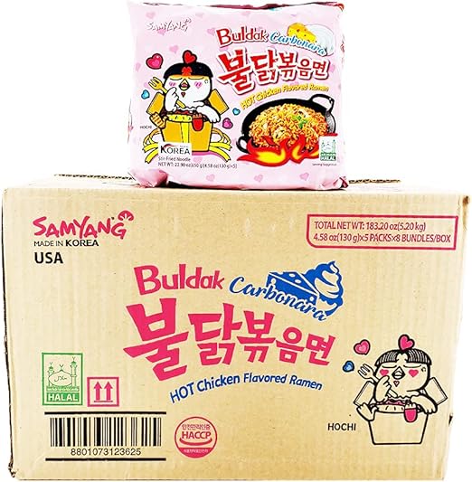 Описание продукта: Рамен Samyang Hot Chicken Flavor Carbonara. Производится на оборудовании, которое также обрабатывает глютен, ракообразные, рыбу, яйца, арахис, сою, молоко, орехи, сельдерей, горчицу, кунжут, люпин и размягчители. Предупреждения об аллергенах: соя, пшеница, глютен, молоко. Рамен Samyang Hot Chicken Carbonara — острая корейская лапша быстрого приготовления со вкусом курицы/карбонары. Состав и пищевая ценность: см. ниже.