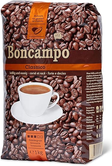 Описание продукта BONCAMPO: Прекрасное сочетание кофе и превосходное мастерство нашего обжарщика гарантируют полное наслаждение. Характеристики: Свежеобжаренный и упакованный в защитной атмосфере для сохранения аромата – Кислотность: 3/5 – Крепость: 3/5 – Насыщенность вкуса: 3/5. Наши рекомендации: Для усиления аромата рекомендуем заваривать кофе свежей мягкой водой – после вскрытия упаковка должна быть герметично закрыта. Совместимость: Идеально подходит для торговых автоматов со встроенной кофемолкой, эспрессо-машин. Экологичность: Наши кофейные зерна сертифицированы UTZ. Мы привержены ответственному и экологически чистому производству кофе.