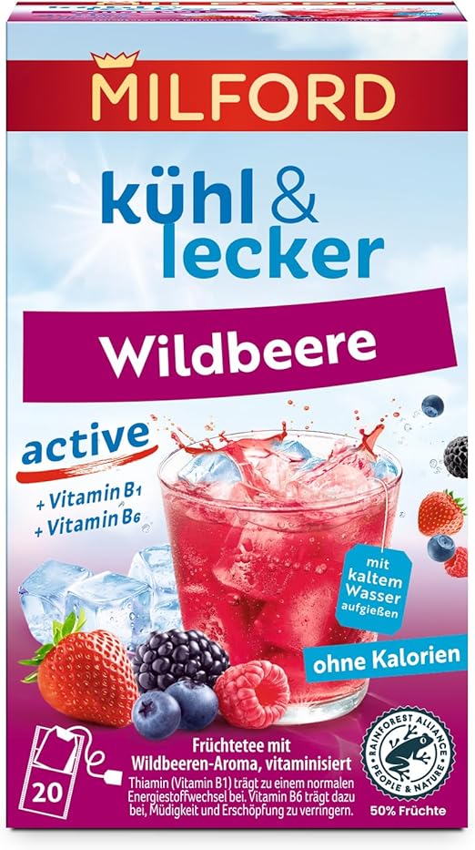 Milford Chłodne i smaczne aktywne dzikie owoce, bez kalorii, bez cukru, laktozy, bezglutenowe, wegańskie, 20 torebek herbaty, 50 g