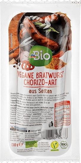 Информация о продукте: ВЕГАНСКАЯ КОЛБАСА (вегетарианская колбаса) Ингредиенты: 64% сейтан* (вода, пшеничный белок*), 17,1% красный перец*, кокосовое масло*, 3,3% лук*, дрожжевой экстракт*, специи* (чеснок*, перец*, горчичная мука*, чили*, перец*, мускатный орех*, душистый перец*, сельдерей*, кориандр*, кардамон*, тмин*, куркума*, имбирь*, тмин*, мускатный орех*, гвоздика*), каменная соль, загуститель: мука из рожкового дерева*, копчение на буковой древесине. *органически выращено.