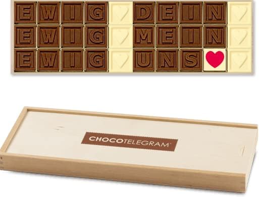 Описание товара: Послание любви с 30 шоколадными камешками из цельного молочного и белого шоколада в деревянной коробке. Камешки украшены буквами, штампованным сердечком и напечатанным сердечком. Вес нетто: 285 г. Размеры упаковки: примерно 32 x 12 x 3 см. Этот продукт не содержит алкоголя. Для защиты от жары в летнее время мы добавляем к вашему заказу охлаждающую батарейку, чтобы ваш шоколад дошёл до вас в целости и сохранности. Бесплатная доставка по Германии при заказе от 40 евро.