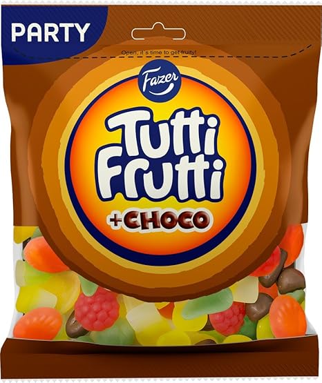 Fazer Tutti Frutti + Choco — mieszanka czekolady, lukrecji i owocowych dziąseł do wina, cukierki, torba imprezowa, 325 g