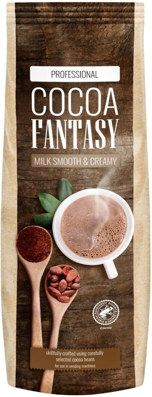 Описание продукта COCOA FANTASY: высококачественный горячий шоколад, изготовленный из тщательно отобранных, обжаренных какао-бобов. Для настоящего наслаждения какао. Вкус: насыщенный какао-напиток с горячим шоколадом. ВЫСОКАЯ ПЛОТНОСТЬ И КАЧЕСТВО: 1 кг какао достаточно для 45 чашек горячего шоколада. Профессиональное качество, подходит для горячих напитков. Идеально подходит для ресторанов, кафе, отелей и предприятий. Рекомендуемая дозировка: 22 г какао-порошка на 125 мл горячей воды (макс. 80°C). Можно использовать в аппаратах для горячих напитков, диспенсерах или непосредственно в чашке. Сертификат: Какао-порошок сертифицирован UTZ и получен из экологически чистого выращивания.