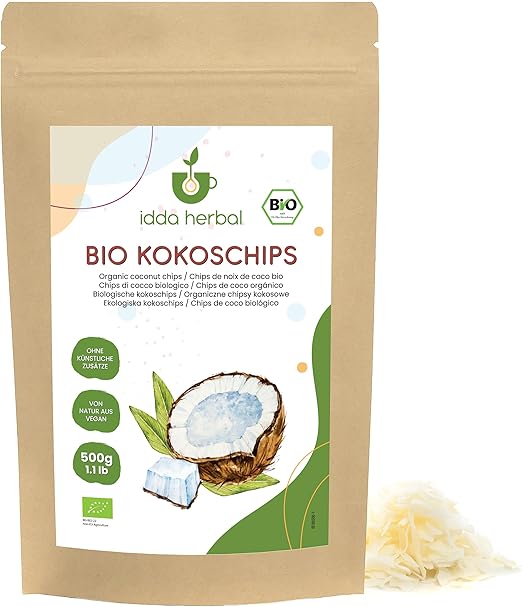 IDDA Herbal Ekologiczne Chipsy Kokosowe 500g, Niesłodzone Surowe Chipsy Kokosowe, Gotowa do Spożycia Przekąska