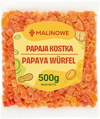 Описание продукта: Кубики засахаренной папайи — это сладкая и яркая закуска, которую можно использовать в самых разных кулинарных блюдах. Их можно есть просто как сладкую закуску. Их можно добавлять в мюсли, гранолу, йогурт и овсянку. Также их можно использовать в качестве добавки к тортам, кексам, печенью и другой выпечке. Упаковка 500 г.