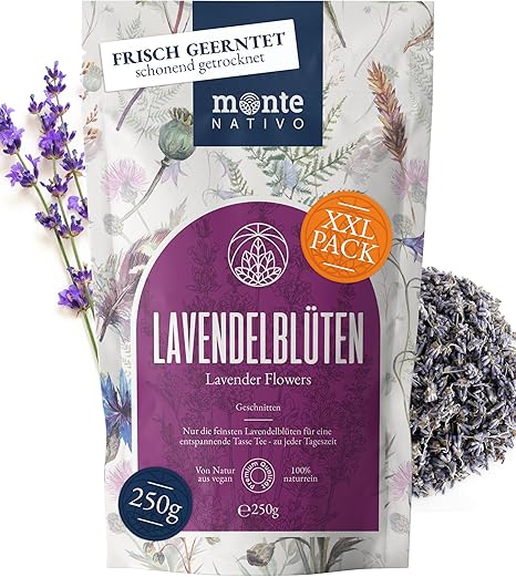 Lavendelblüten (250g) Monte Nativo — Lavendel getrocknet — ohne Zusätze — Blüten für Duftsäckchen und Lavendelsäckchen — 100% rein und natürlich — Zum Essen, für Tee oder als Duft