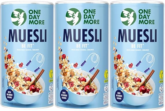 OneDayMore Fitness Musli z wiśniami i cynamonem, bogate w błonnik, źródło cynku i manganu, wspiera metabolizm, odporność i wygląd, wegańskie śniadanie bez soli, 3×450 g tuby płatki owsiane, białko