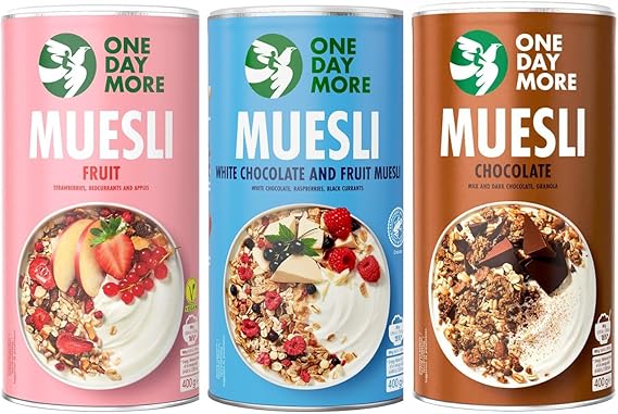 OneDayMore Musli z owocami 1200 g owocowe bez dodatku cukru płatki owsiane wegańskie czekoladowe muesli śniadaniowe naturalne błonnik białko truskawkowe porzeczkowe jabłkowe daktyle rodzynki