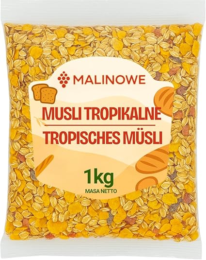 Информация о продукте. Упаковка: 1 кг. Мюсли — это смесь злаков и высококачественных тропических фруктов. Отличный вариант для разнообразного и сбалансированного завтрака. Мюсли легко приготовить. Их можно употреблять в холодном виде с молоком, йогуртом или растительным напитком. Также их можно добавлять в смузи или использовать в качестве ингредиента в выпечке.