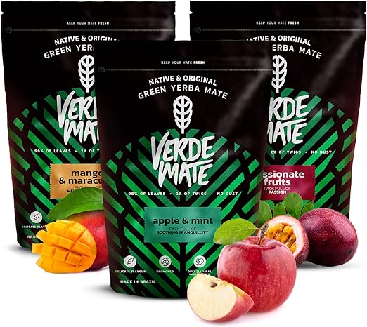 Verde Mate Green Fruity Yerba Mate zestaw do herbaty 3 x 500 g — mango i maracuya, jabłko i mięta, owoce namiętne, brazylijski