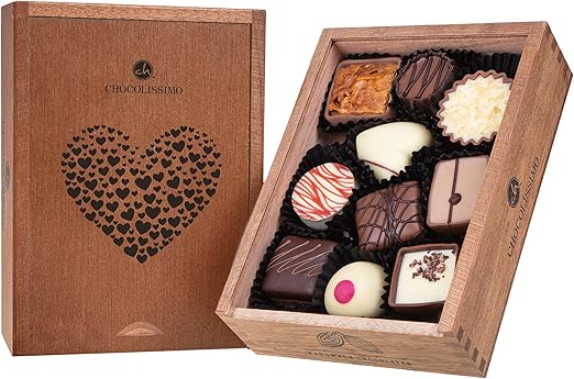 Информация о продукте: 10 оригинальных пралине ручной работы из бархатистого шоколада, некоторые содержат алкоголь. Элегантная и красивая шкатулка из африканского дерева, украшенная сердечком, имеет размеры примерно 14,2 x 10,4 x 3,7 см. Потрясающий внешний вид как шкатулки, так и пралине, а также их восхитительный вкус, привлекут всеобщее внимание; их невозможно игнорировать. Вес нетто: 125 г. Прилагаемое меню точно указывает, какие пралине содержат алкоголь. Изысканный подарок для ценителей тончайших, нежных пралине, которые мы с любовью упаковали в деревянную шкатулку. Это невероятно очаровательный подарок на День святого Валентина.