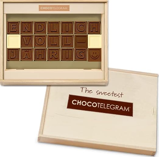 Информация о товаре: Поздравления с 18-летием, состоящие из 21 цельного молочного и белого шоколадного камня в деревянных коробках. Камни содержат буквы и смайлики, которые вместе образуют милое послание. Вес нетто: 200 г. Размеры упаковки: примерно 21 x 24 x 3 см. Этот продукт не содержит алкоголя. Для защиты от жары в летнее время мы добавляем к вашему заказу охлаждающую батарейку, чтобы ваш шоколад прибыл в целости и сохранности. Бесплатная доставка по Германии при заказе на сумму более 40 евро.