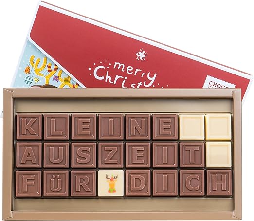 Описание товара: Рождественское послание, составленное из 24 белых и цельномолочных шоколадных камешков в рождественской коробке в форме конверта. Камешки украшены буквами и изображением оленя, которые вместе создают милое послание. Идеальный подарок для семьи, друзей или на Рождество. Вес нетто: 228 г. Размеры упаковки: примерно 26 x 15 x 2 см. Этот продукт не содержит алкоголя. Бесплатная доставка по Германии при заказе на сумму более 40 евро.