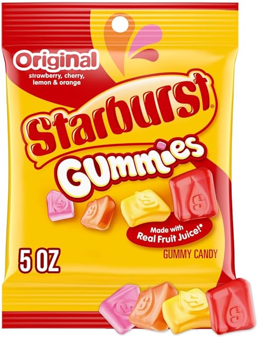 Описание товара: Содержит одну (1) упаковку (140 мл) оригинальных жевательных конфет STARBURST. Мягкие, жевательные и невероятно вкусные, эти оригинальные жевательные конфеты STARBURST со вкусом вишни, лимона, клубники и апельсина заставят ваши вкусовые рецепторы танцевать от восторга. Украсьте свою офисную конфетницу оригинальными жевательными конфетами STARBURST для сладкого и фруктового вкуса. Сделайте ваши киносеансы еще приятнее, подарив взрыв фруктового веселья нашим невероятно сочным оригинальным жевательным конфетам STARBURST. Возьмите с собой упаковку жевательных конфет STARBURST, чтобы наслаждаться всеми своими приключениями и фруктовым удовольствием в дороге.