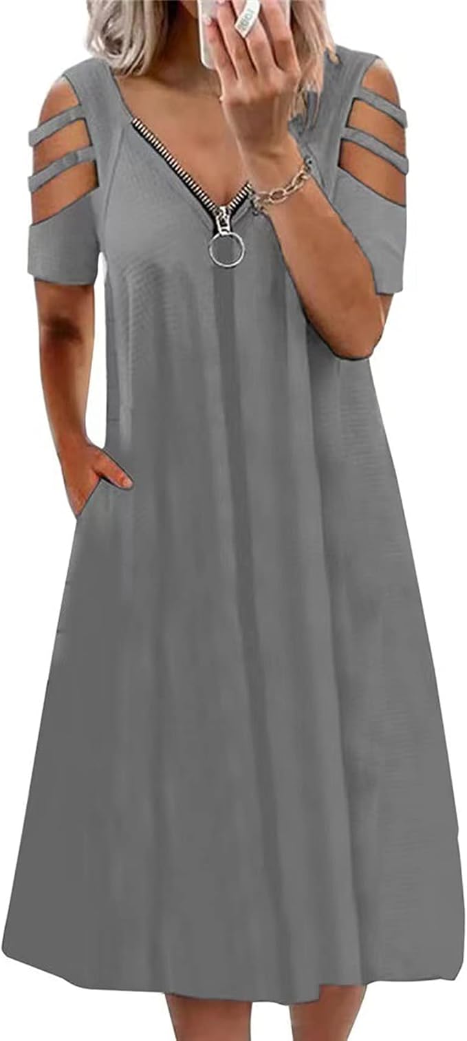 Sukienka Krótki Rękaw Kieszeń na zamek V Neck Lato Sexy Lato Damskie, Szary, XL
