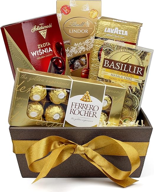 Описание товара: Эта сладкая подарочная корзина идеально подойдет как для себя, так и в подарок другу или любимому человеку. Каждый предмет красиво упакован и представлен в подарочной коробке. Корзина, выполненная в золотом цвете, содержит пралине Ferrero Rocher, пралине Lindor, пралине с вишней и ликером, содержащими 8,5% алкоголя, черный чай Ceylon Basilur и обжаренный молотый кофе Lavazza. Настоящее золотое наслаждение. Откройте для себя вкус Европы – наши индивидуальные подарочные корзины и коробки предлагают широкий выбор ароматов. Этот набор подарочных коробок предназначен для вас, ваших близких или для себя. Не выбирайте только один, наслаждайтесь всеми.