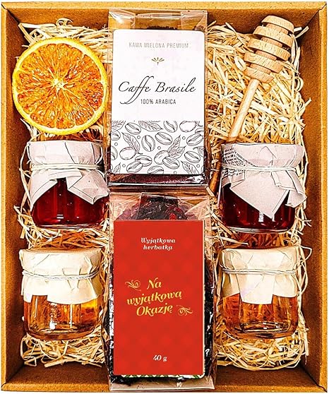 Информация о данном продукте ПОЛНЫЙ ПОДАРОЧНЫЙ НАБОР: Элегантная деревянная корзина содержит 6 тщательно отобранных продуктов — многоцветочный мед, липовый мед, малину в сиропе, варенье, лимон и кофе Caffe Brasile 100% арабика, идеально подходящий в качестве подарка по любому случаю. НАТУРАЛЬНЫЕ ПРОДУКТЫ ВЫСОЧАЙШЕГО КАЧЕСТВА: Набор содержит продукты бренда, удостоенного звания «Здоровый бренд года 2023 и 2022», без консервантов, включая ремесленный мед, фрукты в сиропе и варенье по традиционному рецепту. ЭЛЕГАНТНАЯ УПАКОВКА: Представлен в деревянной подарочной корзине размером 30 x 30 x 12 см с натуральным наполнителем, украшенной сушеными апельсинами и ротанговыми элементами, готовой к вручению. УНИВЕРСАЛЬНОЕ ПРИМЕНЕНИЕ: Продукты идеально подходят в качестве добавки к чаю, кофе, десертам, блинам, тостам или в качестве натуральных подсластителей, их можно употреблять в чистом виде или использовать в выпечке и кулинарных блюдах. СОДЕРЖИМОЕ И ХАРАКТЕРИСТИКИ: Общий вес набора 1500 г, объем жидких продуктов 1000 мл, упаковано в стеклянные банки с двойной защитой, польский продукт от производителя Spichlerz.