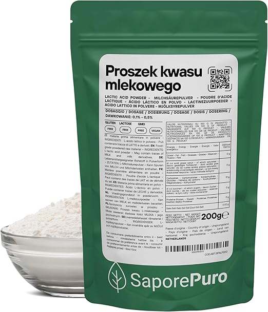 Порошок молочной кислоты SaporePuro 200 г – чистый пищевой продукт – для выпечки, молочных продуктов, ферментированных напитков и косметических применений.