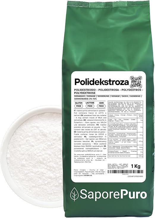 БОГАТ РАСТВОРИМОЙ КЛЕТЧАТКОЙ – Полидекстроза является источником легкорастворимой клетчатки, идеально подходящей для обогащения рецептов без изменения вкуса. НИЗКОКАЛОРИЙНЫЙ – Всего 1 ккал на грамм: идеально подходит для легких рецептов, низкокалорийных диет и продуктов с пониженным содержанием сахара. НАТУРАЛЬНЫЙ ЗАГУСТИТЕЛЬ И СТАБИЛИЗАТОР – Улучшает текстуру мороженого, десертов и выпечки, предотвращая кристаллизацию сахара. ИДЕАЛЬНО ДЛЯ ВЫПЕЧКИ – Увеличивает влажность и срок хранения, помогает продуктам дольше оставаться свежими, снижает содержание сахара и жира, создавая более полезные и легкие десерты. ИДЕАЛЬНО ДЛЯ МОРОЖЕНОГО И ДЕСЕРТОВ – Улучшает кремообразность и стабильность, уменьшает образование кристаллов льда и создает более легкие и гладкие десерты. › Подробнее о продукте