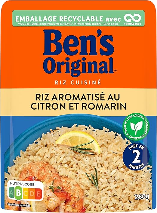 Описание продукта: Рис быстрого приготовления «Лимон и розмарин за 2 минуты»: Рис BEN’S ORIGINAL с восхитительным лимонно-розмариновым вкусом и семенами горчицы готовится за 2 минуты в микроволновой печи или на сковороде. Этот рис — настоящая экономия времени для здорового и вкусного обеда. Пищевая ценность риса: B: Состав не содержит искусственных красителей, консервантов и ароматизаторов, в соответствии с законодательством. Этот рис содержит тщательно отобранные ингредиенты. Пищевая ценность: B. Примечание Юки: 75/100. Перерабатываемая упаковка: BEN’S ORIGINAL и TerraCycle создают первую программу переработки пакетов для микроволновой печи. Утилизируйте использованные пакеты для микроволновой печи в общественных пунктах сбора, чтобы дать им вторую жизнь. Произведено во Франции: Этот рецепт разработан на производственном предприятии в Шатодене, в регионе Центр-Вэлли долины Луары.