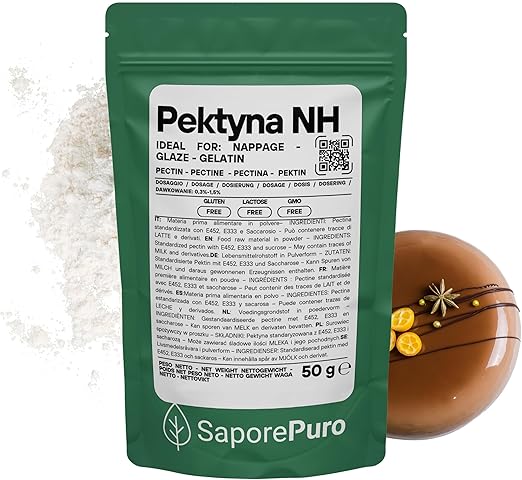 Об этом продукте Идеально подходит для любого рецепта – Пектин NH SaporePuro – это надежный ингредиент в кондитерском деле: универсальный и надежный, он адаптируется к различным рецептам, всегда сохраняя правильную консистенцию, независимо от pH и типа фруктов. Водорастворимый – Пектин NH SaporePuro легко растворяется в воде. Для достижения наилучших результатов его следует предварительно смешать с сахаром, чтобы избежать образования комков, а свои желирующие свойства он приобретает при нагревании. Фруктовое желе – Позволяет приготовить мягкое и однородное желе с меньшим количеством сахара, чем в традиционных рецептах, что дает лучший результат, чем при использовании классического пектина. Глазурь для тортов – Идеально подходит для создания блестящей и стойкой глазури для тортов и десертов, улучшая внешний вид и сохраняя влажность выпечки. Наппаж для фруктовых тартов – Идеально подходит для создания блестящего и прозрачного слоя на фруктовых тартах, продлевая их свежесть. Термообратимый и натуральный – Можно разогревать и использовать повторно без потери качества; Высокое содержание клетчатки (≈85%), низкое содержание жира, низкое содержание белка и натуральный безглютеновый продукт. ⚖️ Рекомендуемая дозировка – используйте от 0,8% до 1,6% в зависимости от типа продукта и желаемой консистенции.