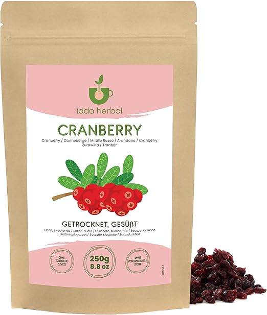 IDDA Herbal Suszona Żurawina 250g, Całe Suszone Owoce Żurawiny, Słodzone Sokiem Jabłkowym