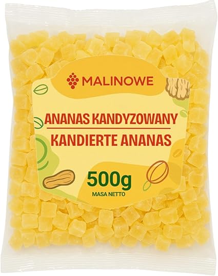 Описание продукта: Засахаренный ананас — это сладкая закуска, приготовленная путем обмакивания ломтиков ананаса в сахарный сироп. Засахаренный ананас отличается насыщенным сладким вкусом, который достигается благодаря процессу засахаривания. Процесс засахаривания придает ананасу мягкую, гелеобразную консистенцию, что делает его удобным для употребления в качестве закуски. Его можно использовать в качестве добавки к десертам, тортам и мороженому, а также в качестве украшения для блюд и коктейлей.
