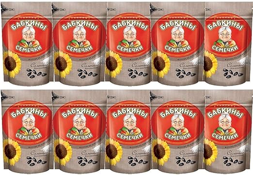 Информация о продукте: 10 упаковок жареных и соленых семечек подсолнечника по 250 г. Отборные семечки подсолнечника, размер 38+, в оригинальной коробке. Благодаря застежке-молнии семечки дольше остаются свежими.