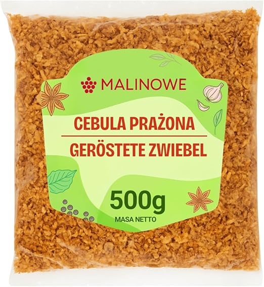 Описание продукта: Хрустящая добавка к блюдам: Жареный лук — популярная добавка ко многим блюдам, особенно любимая за свою хрустящую текстуру и насыщенный вкус. Насыщенный вкус: Он обладает интенсивным, слегка сладковатым и карамелизированным вкусом, который особенно ярко проявляется после жарки. Вкус становится более сложным, чем у сырого лука, с нотками поджарки и сливочного масла. Золотистая текстура: После жарки лук становится золотистым и хрустящим. При правильном хранении он долго сохраняет свою хрусткость. Универсальное применение: Часто используется в качестве начинки для гамбургеров, хот-догов, бутербродов и салатов. Идеально подходит в качестве ингредиента для запеканок, например, в качестве начинки для картофельных запеканок. Премиальная упаковка 500 г: Большая упаковка, содержащая 500 грамм ароматного жареного лука, достаточная для многократного использования на кухне.