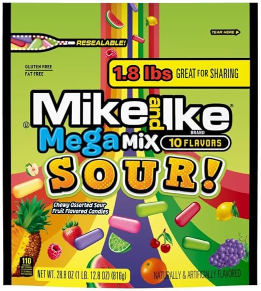 Описание товара Насладитесь 10 МЕГА-вкусами кислых жевательных конфет: Кислое яблоко, Кислая клубника, Кислая вишня, Кислый лимон, Кислый зеленый лимонад, Кислый пунш, Кислый ананас, Кислый арбуз, Кислая виноградная газировка и Кислая малина. Упаковка для ваших любимых фруктовых конфет: Эта вертикальная упаковка Mike and Ike Mega Mix Sour объемом 825 мл идеально подходит для того, чтобы поделиться с друзьями и семьей во время путешествий, просмотра спортивных матчей или перерыва на учебу. Забота о себе: Эти фруктовые жевательные конфеты кошерны, не содержат глютена и жира, поэтому вы можете наслаждаться этими уникальными конфетами и не бояться делиться ими с друзьями. Наполните свой день: Наполните свои выходные игровыми вечерами, вечеринками, музыкальными сессиями и встречами, или положите несколько конфет Mike and Ike в рюкзак и возьмите с собой фруктовый вкус в дорогу. 10 вкусов кислых фруктовых конфет в каждой упаковке: от прогулки по городу до вечера в кино — нет лучшего способа улучшить свою неделю, чем насыщенный кислый фруктовый вкус жевательных конфет Mega Mix SOUR в нашей герметичной упаковке объемом 825 мл.