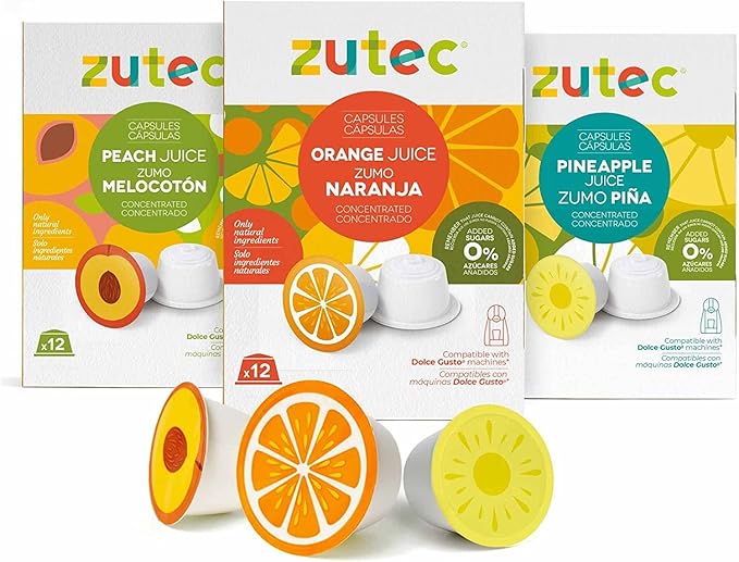 Zutec — Капсулы с ароматом сока (апельсин, ананас и персик) — Совместимо с кофемашинами Dolce Gusto* — 3 упаковки по 12 капсул — 36 капсул