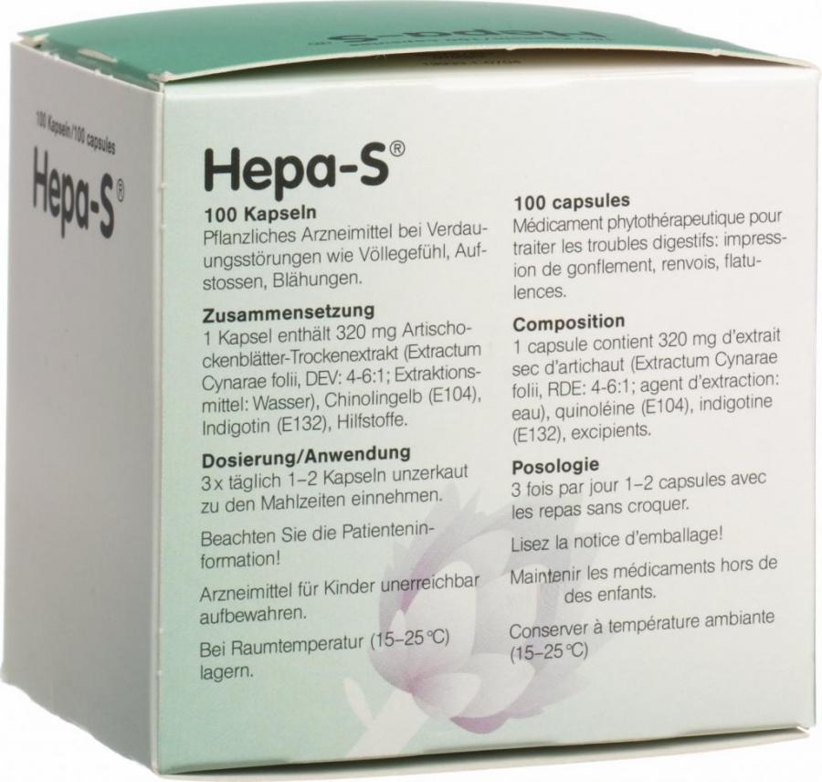 Экстракт листьев артишока является желчеобразующим и оказывает благоприятное влияние на выделение желчи из печени. Hepa-S способствует пищеварению. Hepa-S используется при неспецифическом расстройстве желудка, таком как отрыжка, вздутие живота, особенно из-за расстройства пищеварения.