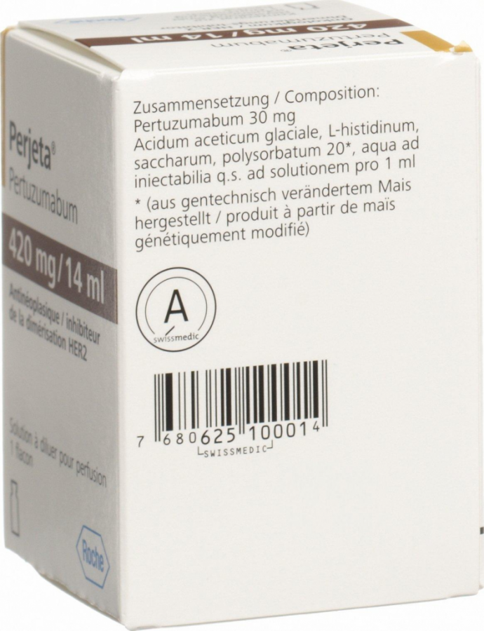 Противоопухолевый препарат. Пертузумаб представляет собой рекомбинантные гуманизированные моноклональные антитела, которые избирательно взаимодействуют с отвечающим за димеризацию внеклеточным субдоменом II HER2 (рецептора эпидермального фактора роста человека 2 типа). Связывание пертузумаба с субдоменом II блокирует процесс лиганд-зависимой гетеродимеризации HER2 с другими белками семейства HER, включая EGFR (рецептор эпидермального фактора роста человека), HER3 (рецептора эпидермального фактора роста человека 3 типа) и HER4 (рецептора эпидермального фактора роста человека 4 типа). Таким образом, пертузумаб ингибирует лиганд-инициированную передачу внутриклеточных сигналов по двум основным сигнальным путям: путь митоген-активированной протеинкиназы (MAP) и путь фосфоинозитид-3-киназы (PI3K). Угнетение данных сигнальных путей способно привести к остановке роста клеток и апоптозу, соответственно. Кроме того, пертузумаб способствует активации антитело-зависимой клеточной цитотоксичности (АЗКЦ).