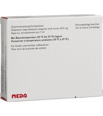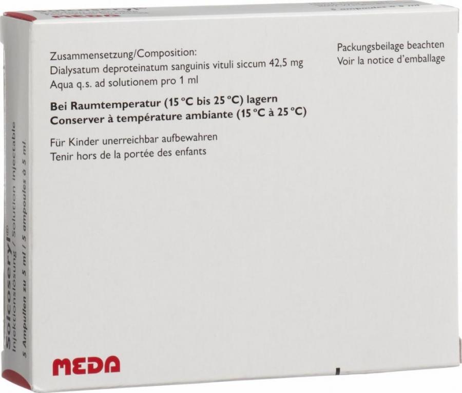 Препарат представляет собой депротеинизированный гемодиализат, содержащий широкий спектр низкомолекулярных компонентов клеточной массы и сыворотки крови молочных телят с молекулярной массой 5000 D (гликопротеиды, нуклеозиды и нуклеотиды, олигопептиды, аминокислоты).